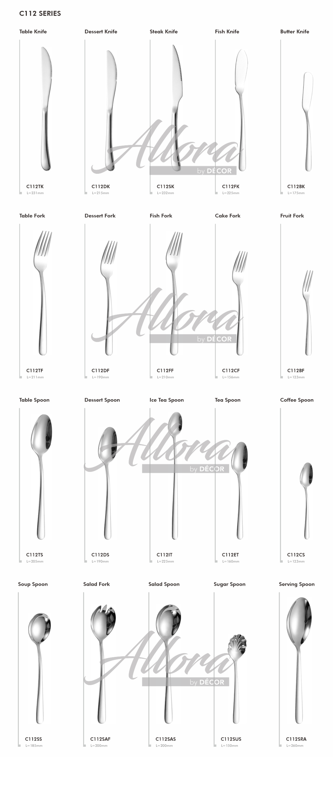 The C112 Series offers a comprehensive selection including Dessert Fork, Soup Spoon, Ice Tea Spoon, Butter Knife, Coffee Spoon, Salad Fork, Salad Spoon, Steak Knife, Sugar Spoon, Fruit Fork, Cake Fork, Fish Fork, and Fish Knife.