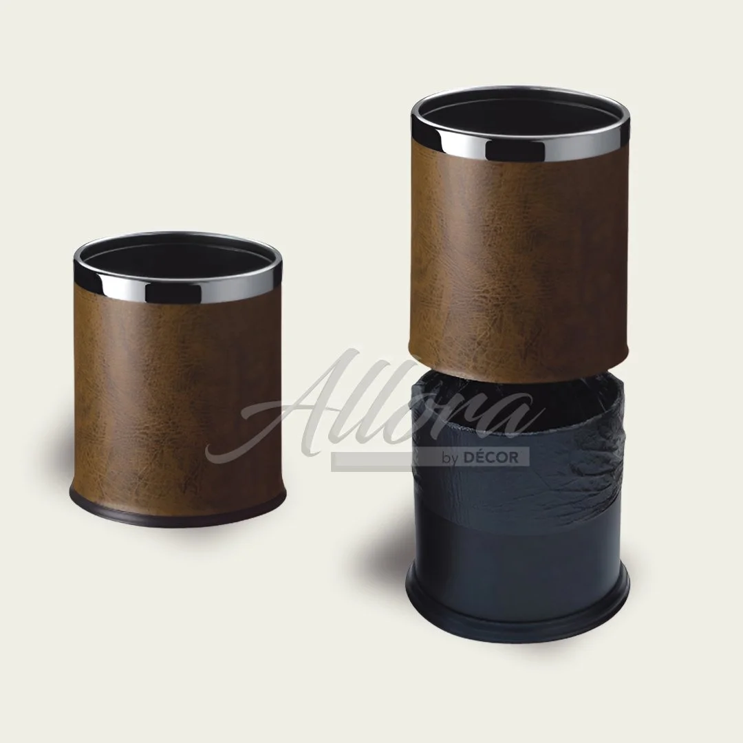 This best-selling waste bin is trusted by leading hospitality brands worldwide and provides the ideal balance of high-end design aesthetics and robust commercial construction. Wrapped in elegant Tawny faux leather and accented with a stainless steel ring, this unit instantly elevates room decor while providing essential, dependable functionality.